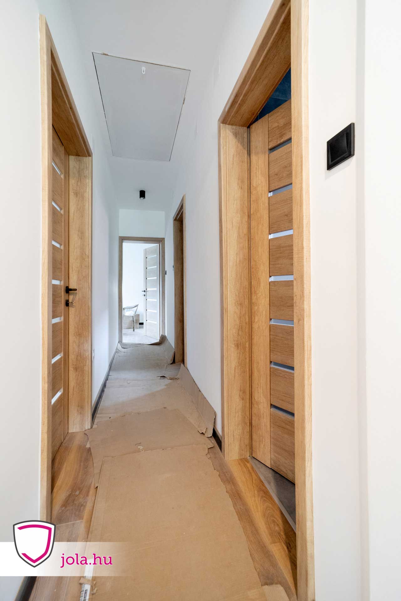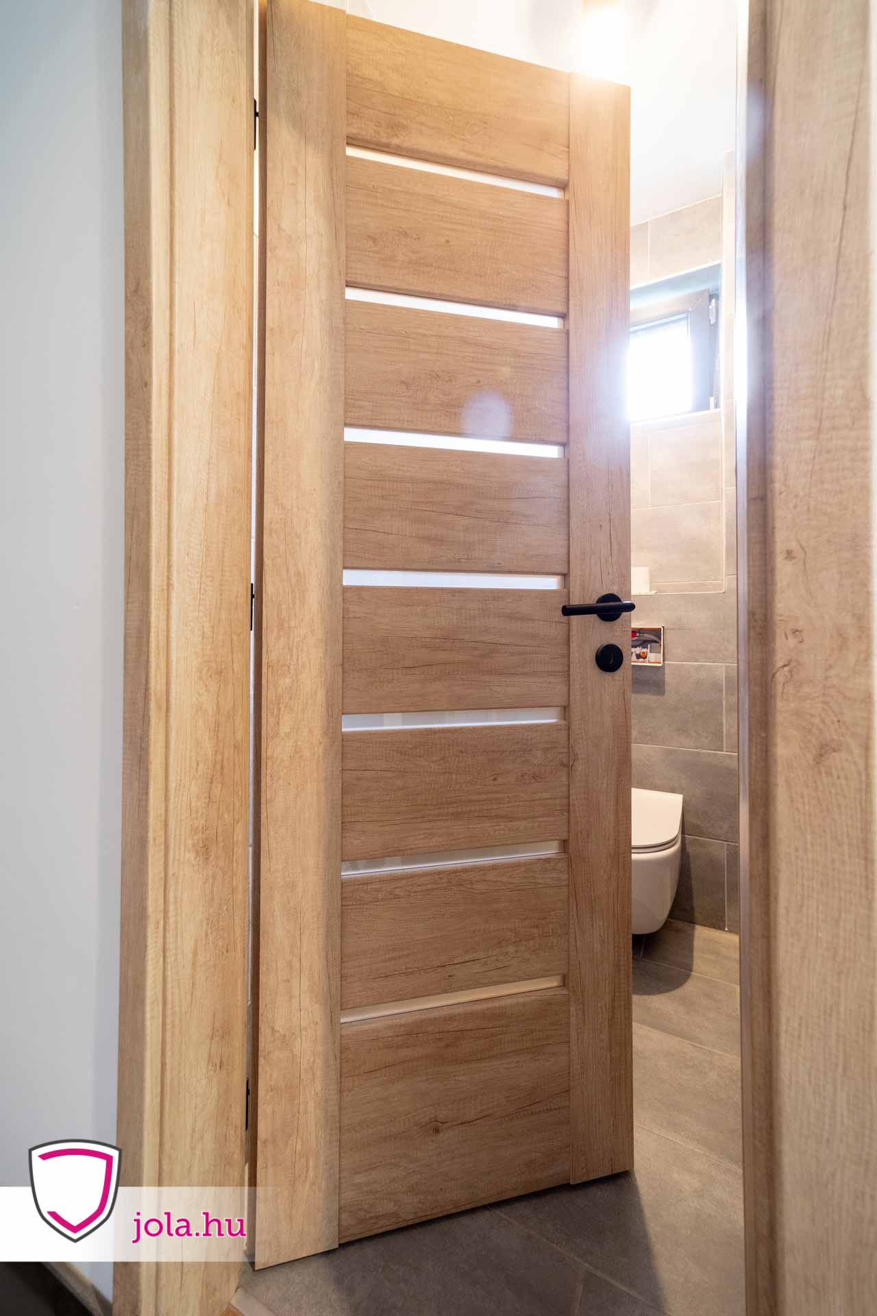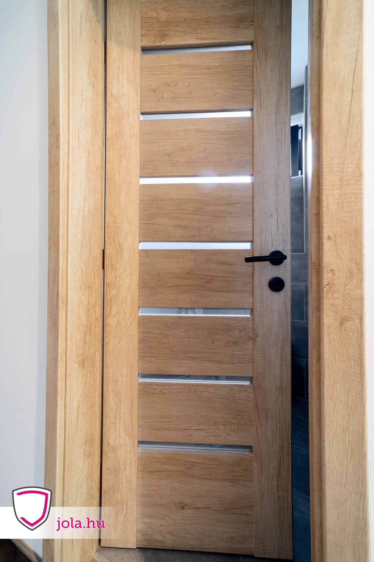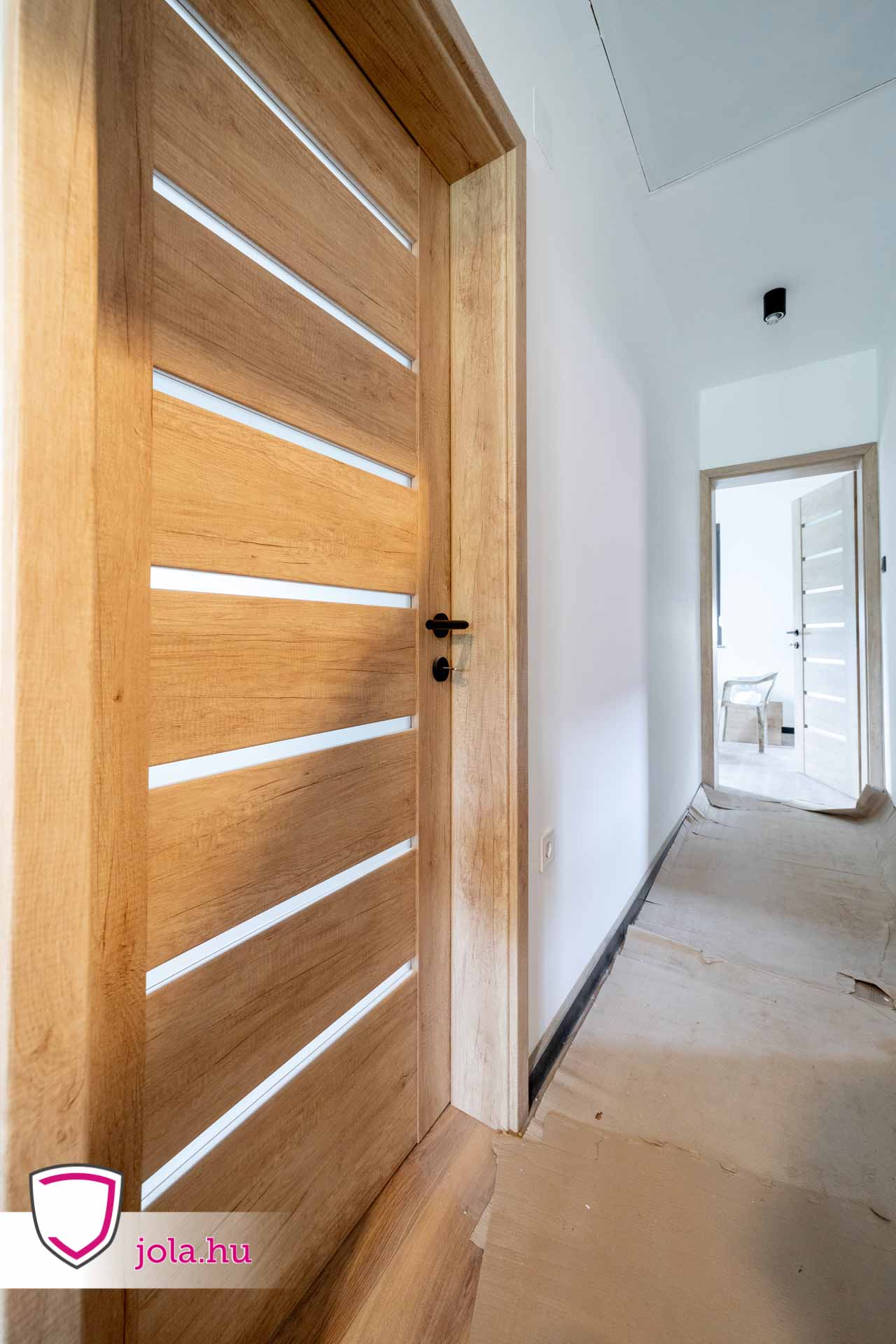 Beltéri ajtók közül Zoltánék a rendkívül megbízható Rhino termékcsalád Q-1 típusát választották, nebraszka tölgy színben, savmart üveggel.