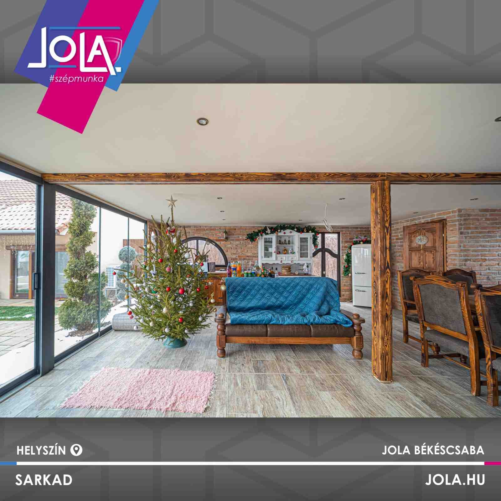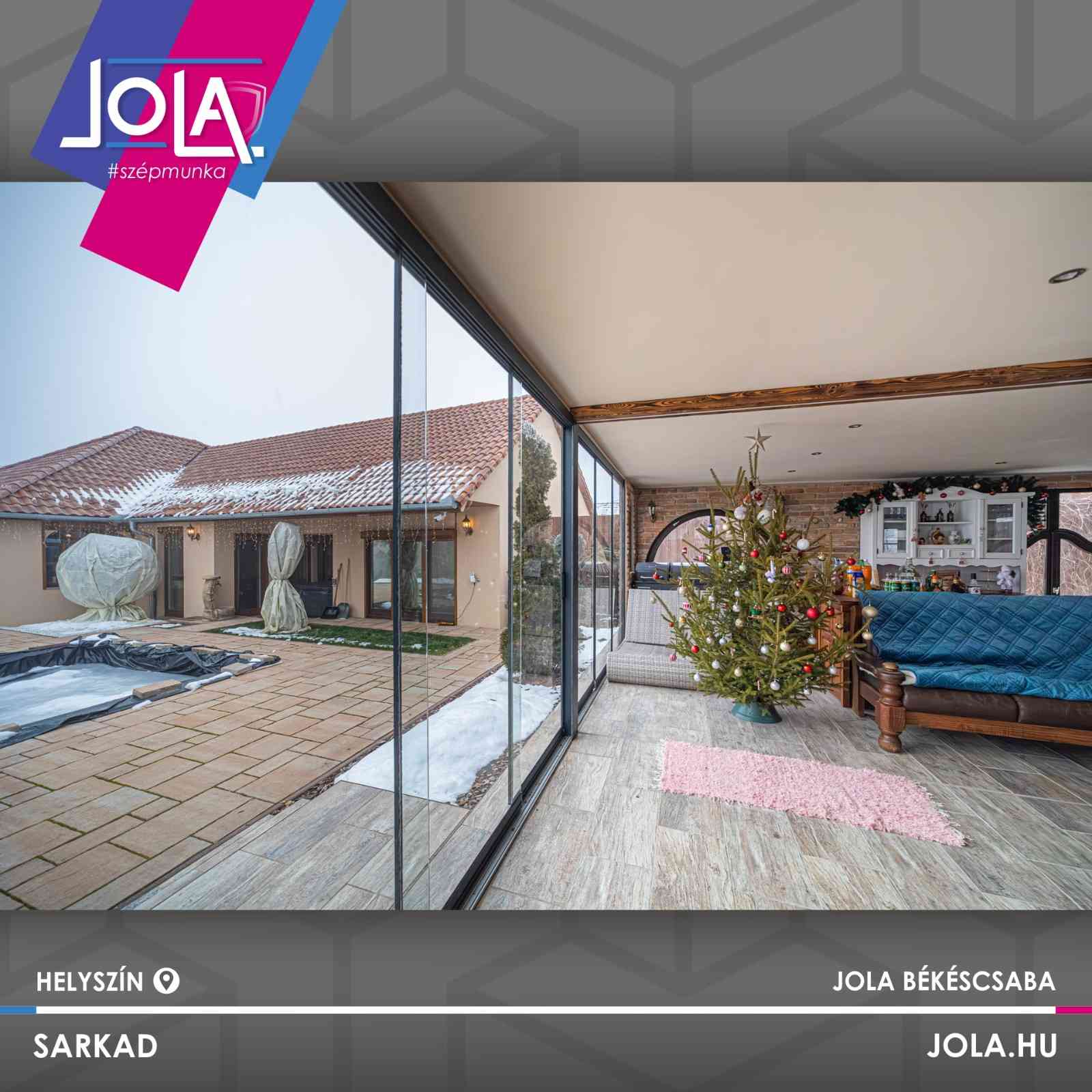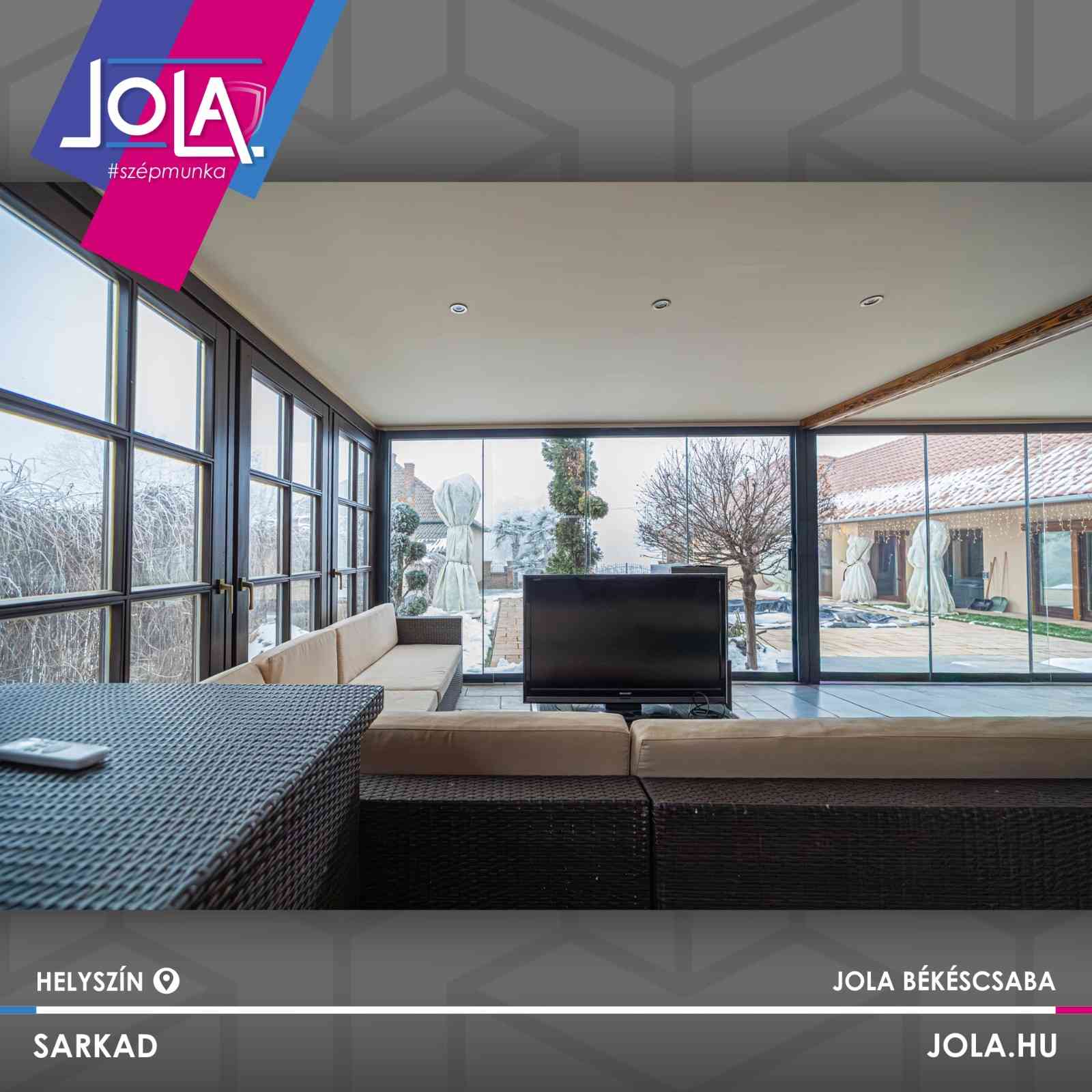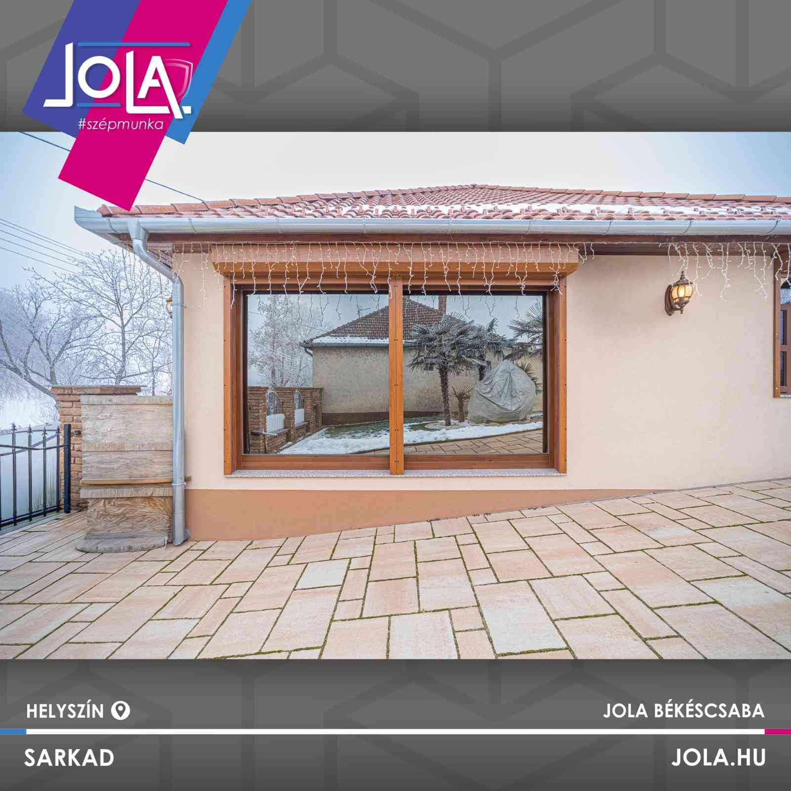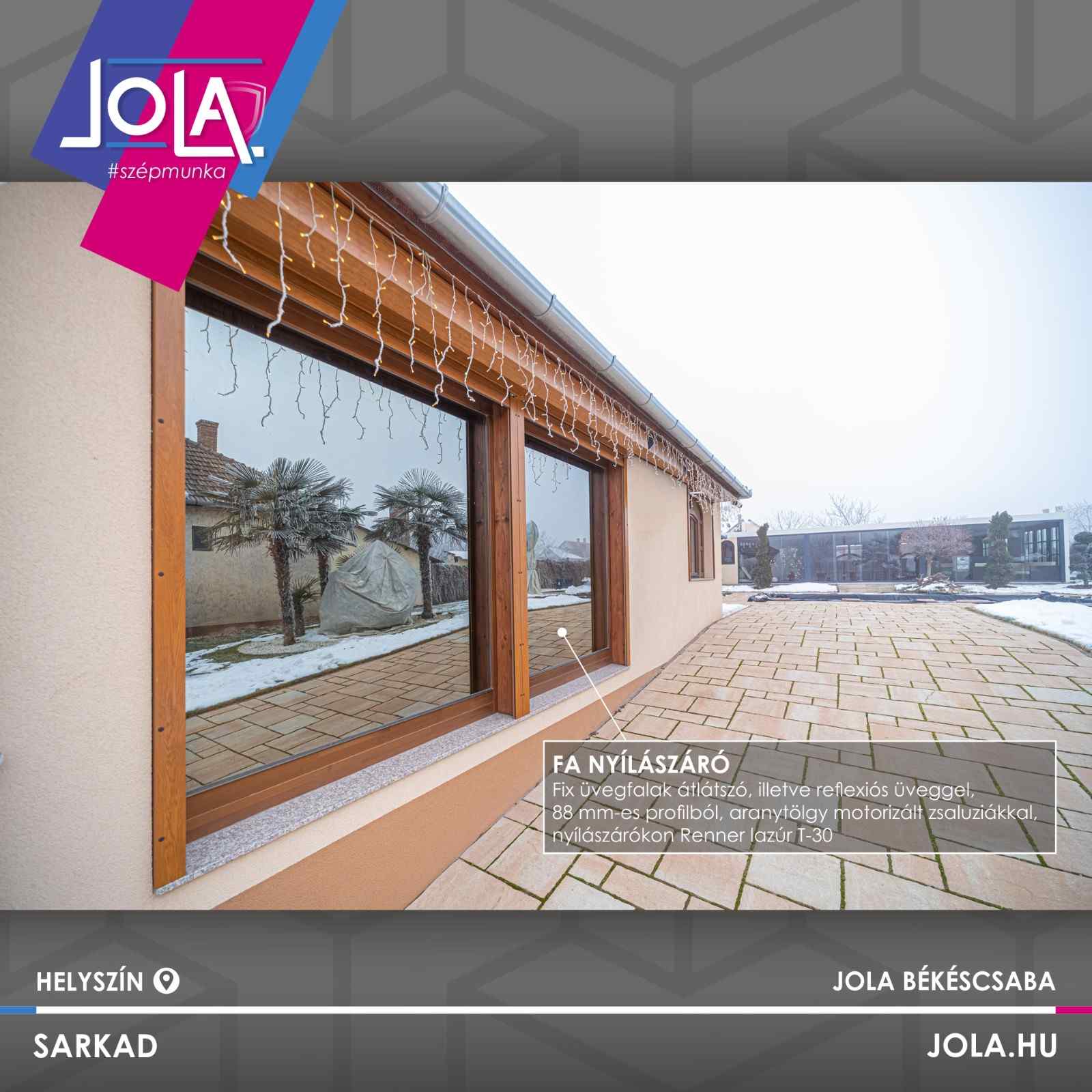 Telepítettünk egyrészt fa nyílászárót, fix üvegfalakkal, átlátszó illetve reflexiós üveggel, 88-as profilból, aranytölgy motorizált zsalúziával.