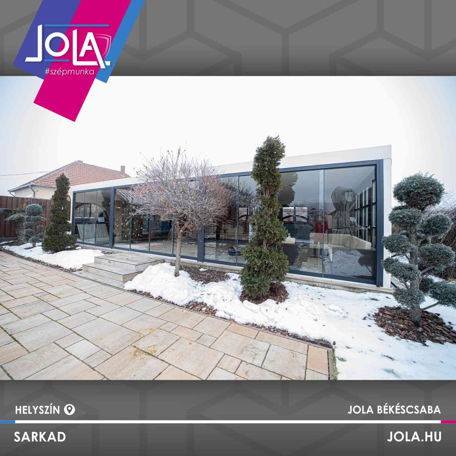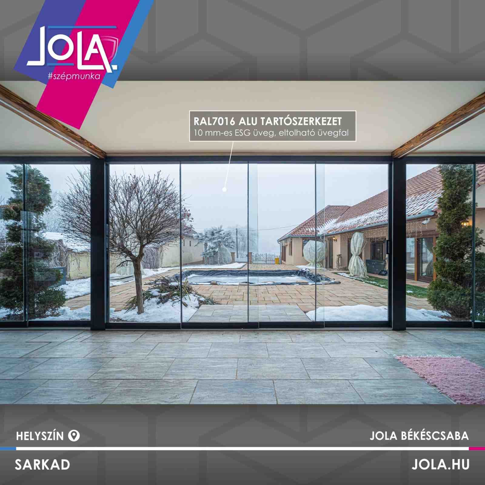 A különleges, eltolható üvegfal esetében egy RAL 7016 színre fújt alu szerkezet segíti az ESG üvegrendszer futását.