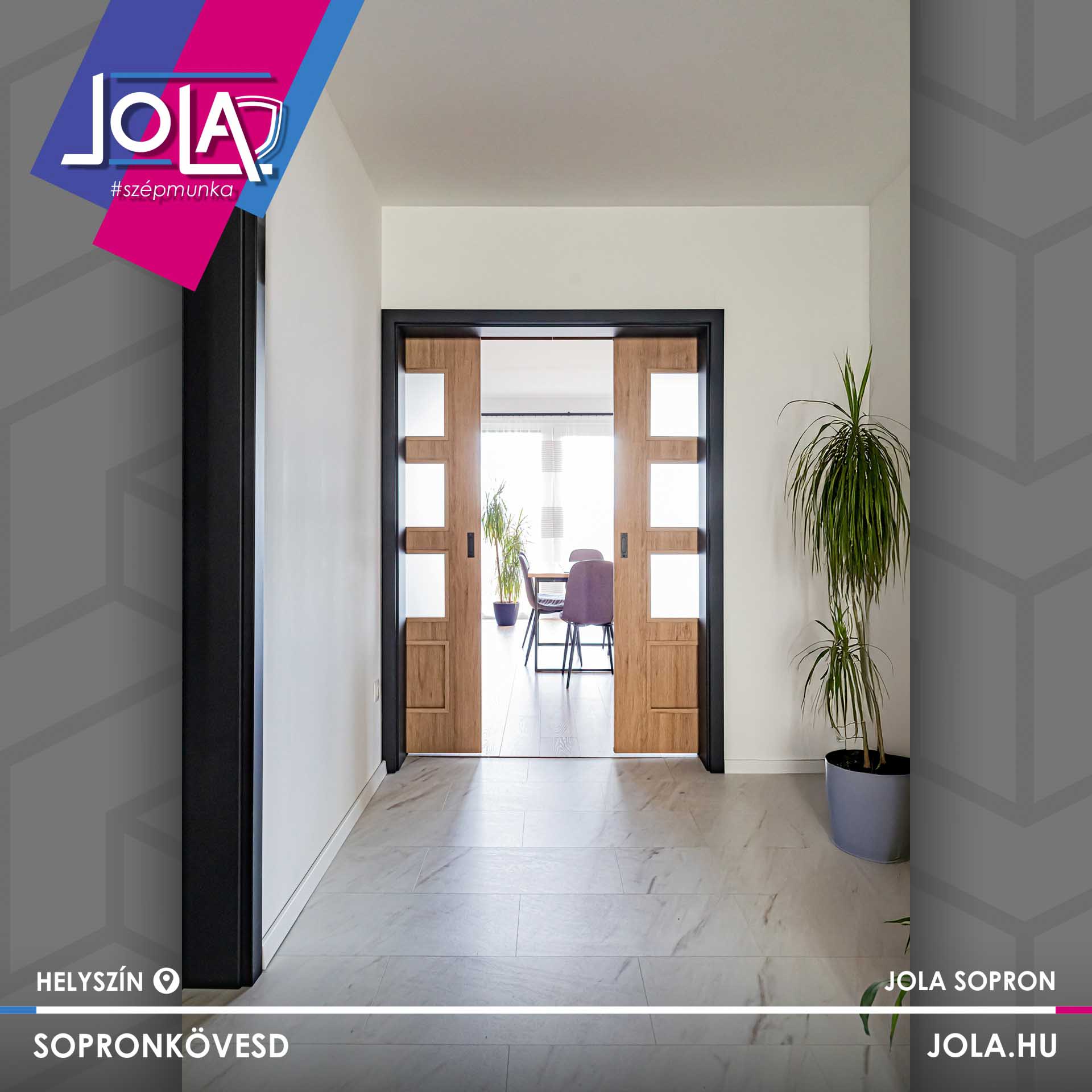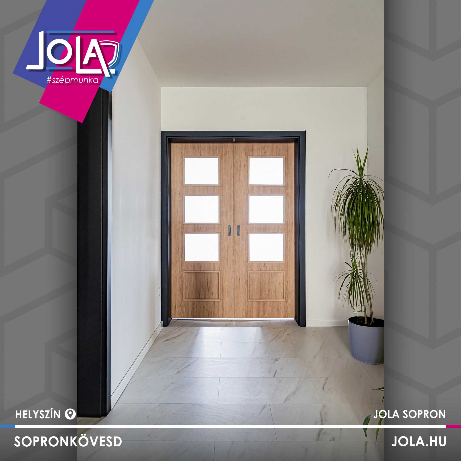 Beltéri ajtók: Tölgy premium CPL fólia, fekete ST CPL tokok, Ludas 203 fekete intarziás ajtólapok és Szatmár 5 kétszárnyú üveges tolóajtó.