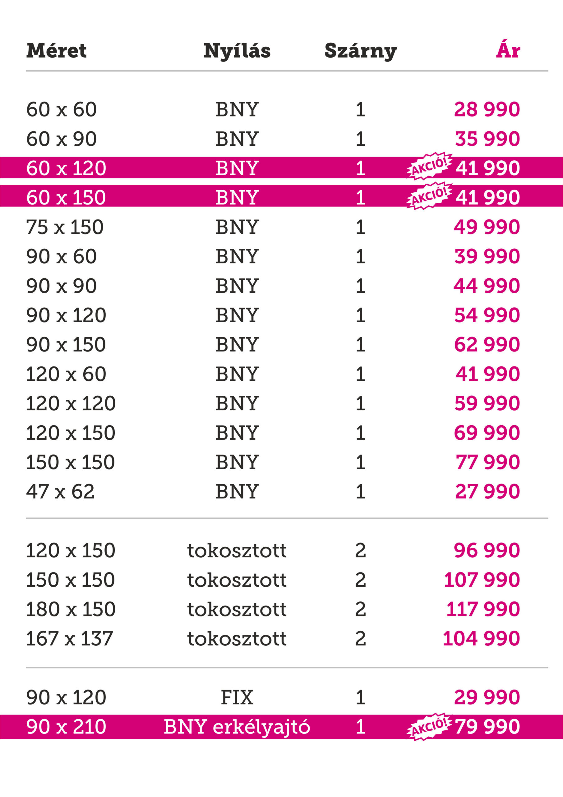 A BNY (bukó-nyíló) jobbos és balos kivitelben is, a tokosztott és FIX csak egyféle