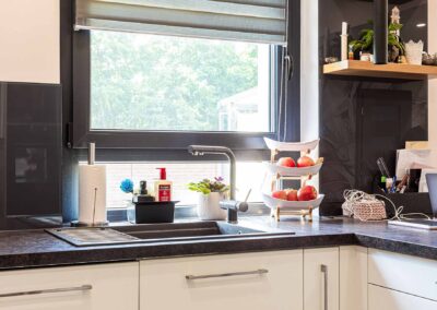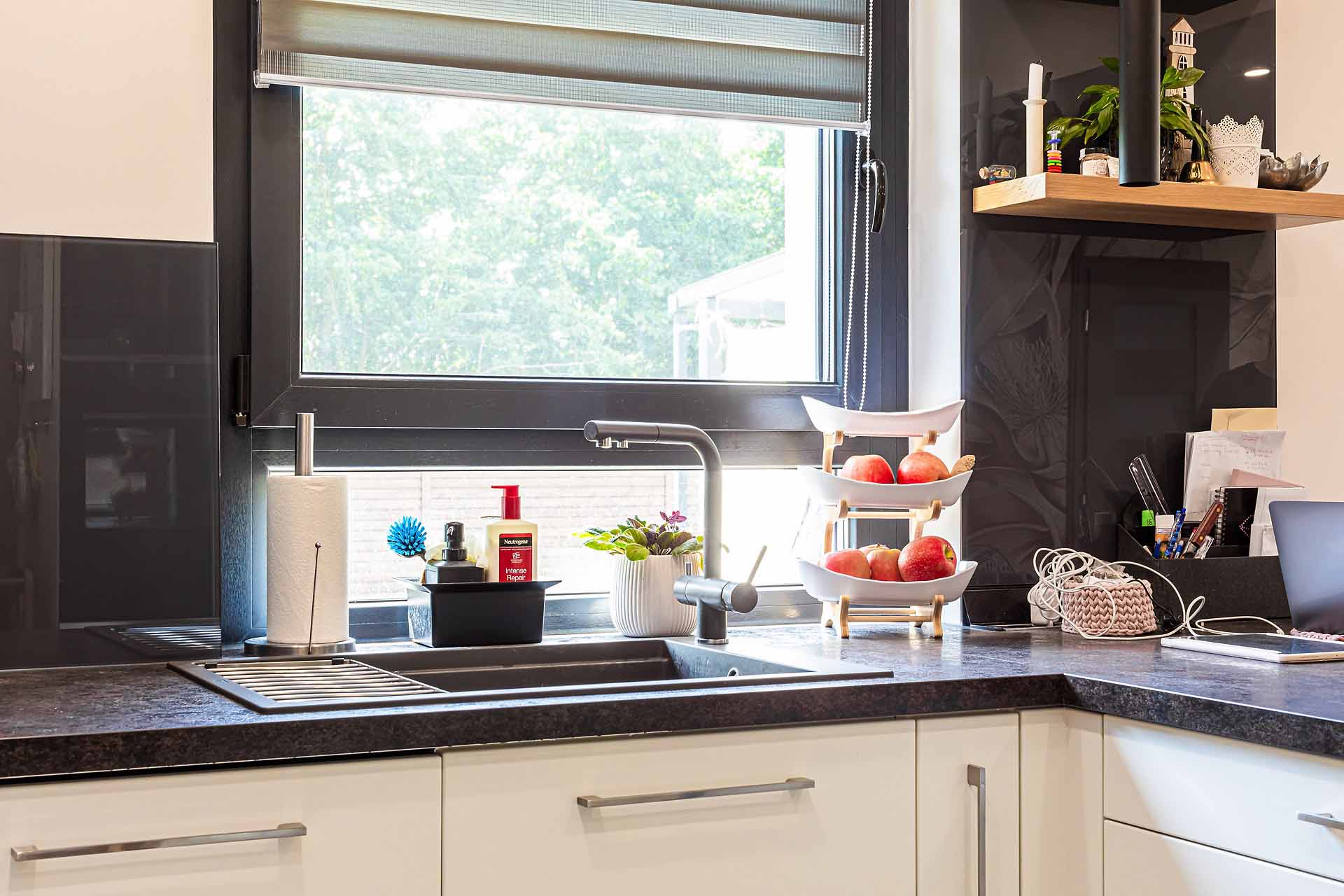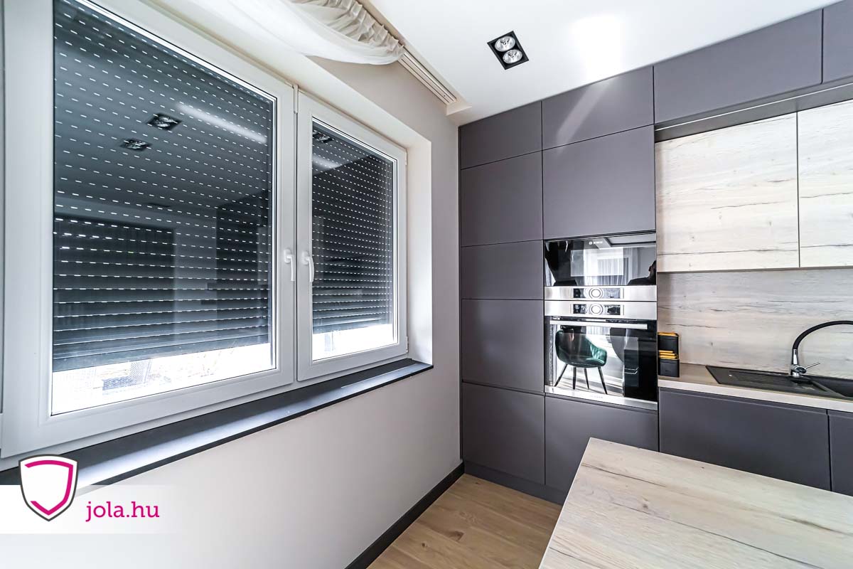 Gealan Linear ablak antracit redőnnyel és dió könyöklővel, konyhai sarok Győrben