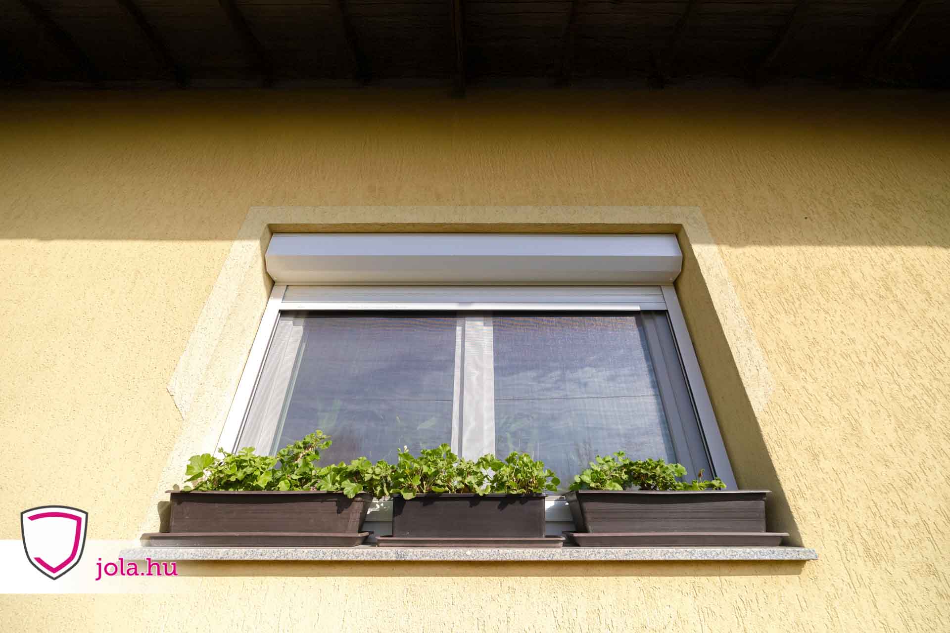 Pusztaszabolcsi ablak redőnnyel beépítve, virágládával