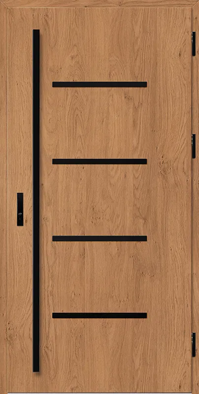 | Szárny és szárny merevítése: | PVC furnérral borított horganyzott acéllemezből, négyoldalas falccal, ragasztott fa kerettel, PUR habbal kitöltött ajtószárny |