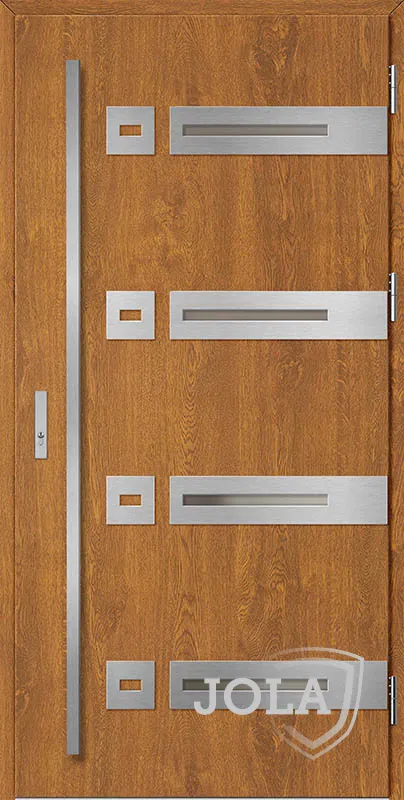 | Szárny és szárny merevítése: | PVC furnérral borított horganyzott acéllemezből, négyoldalas falccal, ragasztott fa kerettel, PUR habbal kitöltött ajtószárny |