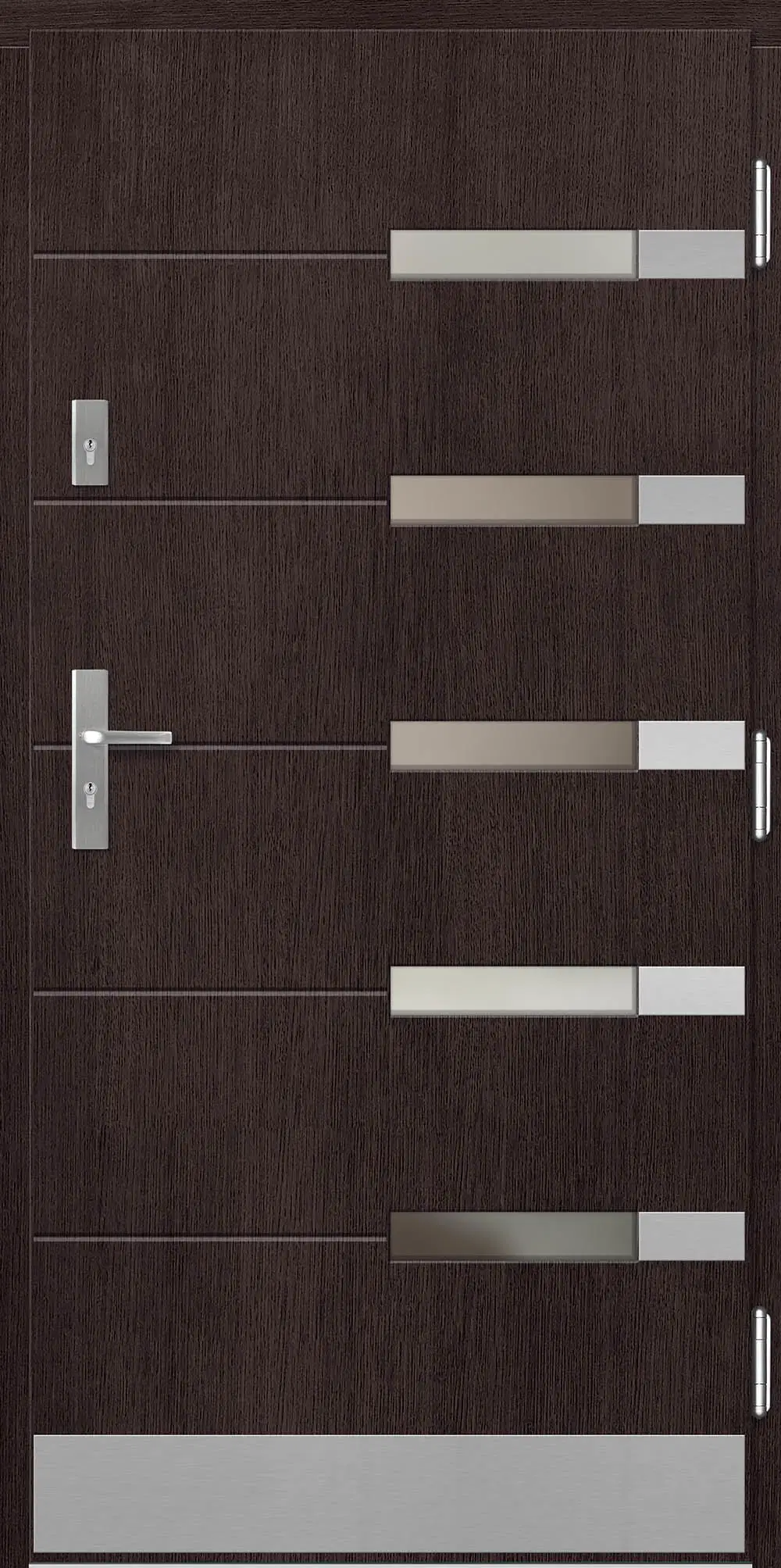 Leírás: A nemes szálcsiszolt alumínium a természetes fával együtt kiváló dizájnt képez. Az Inox betét ezenkívül védi az ajtó felületét a külső károsodásoktól.