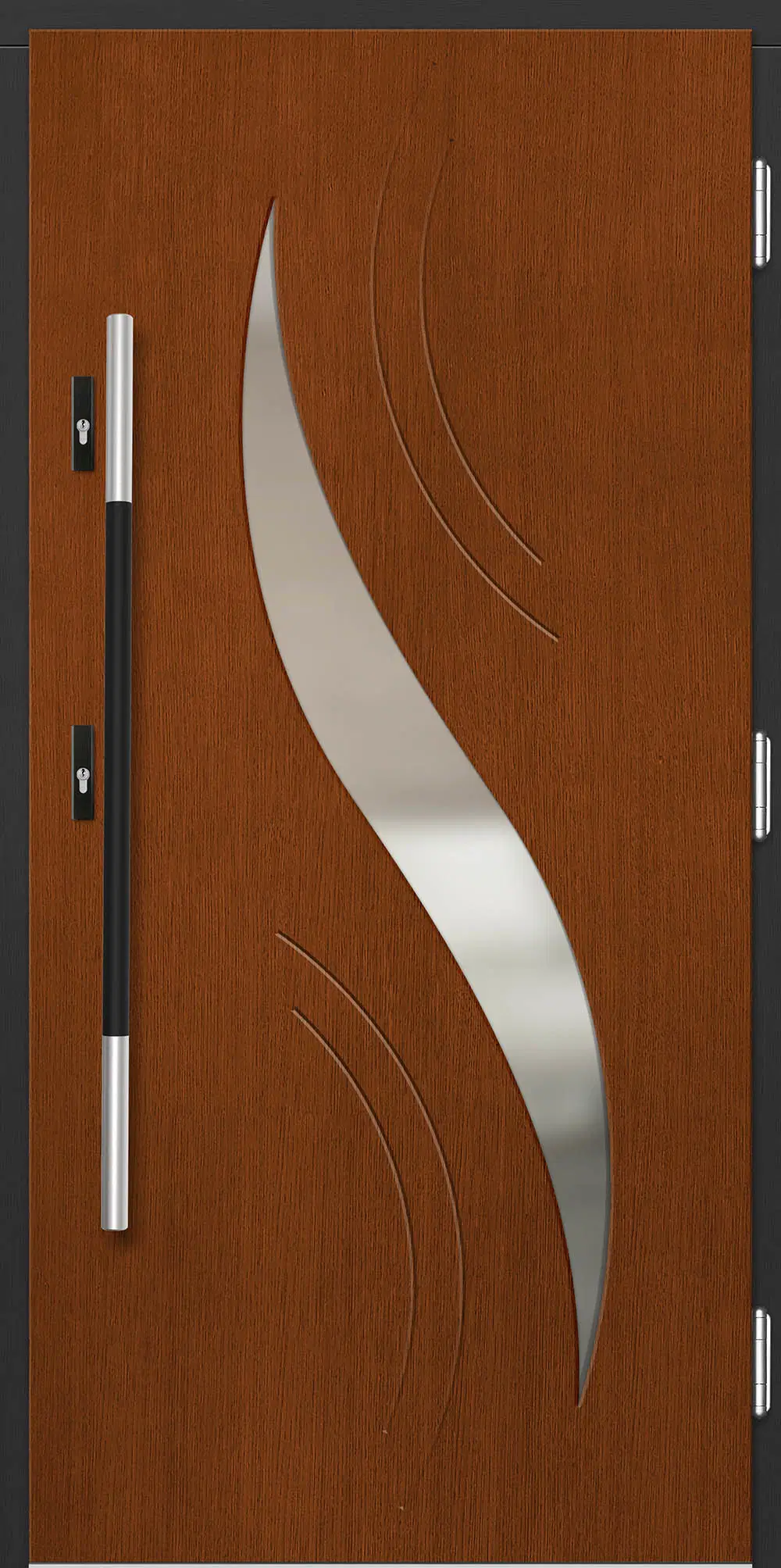 Leírás: A nemes szálcsiszolt alumínium a természetes fával együtt kiváló dizájnt képez. Az Inox betét ezenkívül védi az ajtó felületét a külső károsodásoktól.