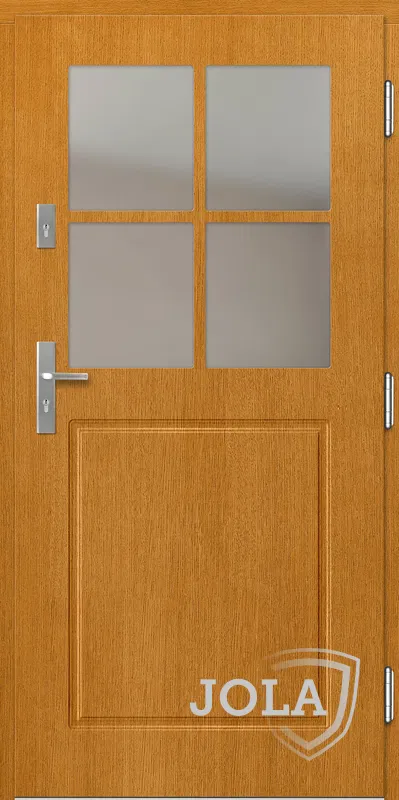 Kivitelezés: Tömítés a szárnyban és a tokban, betörésgátló csap a zsanér oldalán, a szárny külső burkolata vízálló rétegelt lemezből készült, a szárny belső szerkezete poliuretán habbal töltött méhrács.