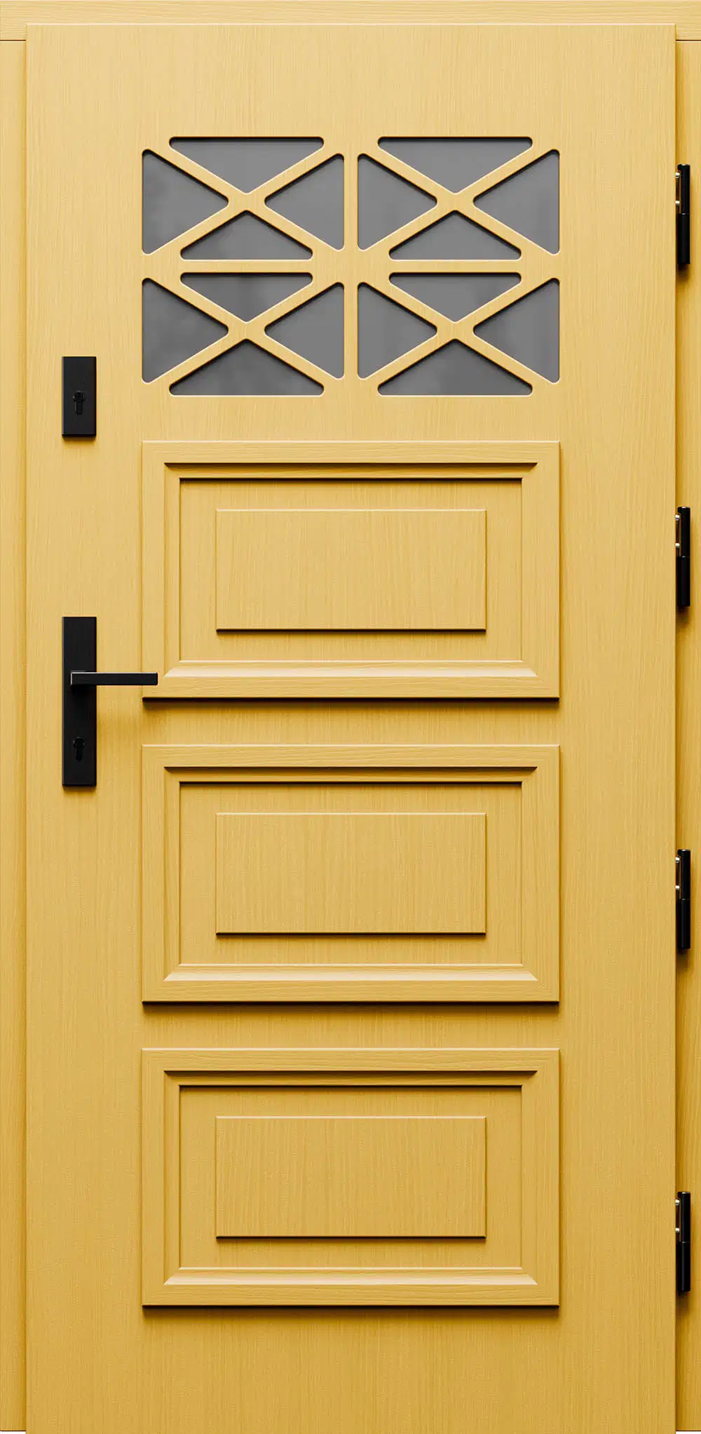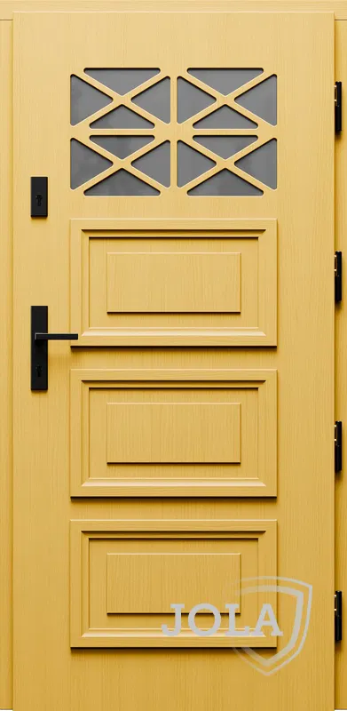 Kivitelezés: Tömítés a szárnyban és a tokban, betörésgátló csap a zsanér oldalán, a szárny külső burkolata vízálló rétegelt lemezből készült, a szárny belső szerkezete poliuretán habbal töltött méhrács.