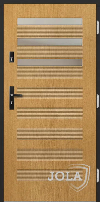 Kivitelezés: Tömítés a szárnyban és a tokban, betörésgátló csap a zsanér oldalán, a szárny külső burkolata vízálló rétegelt lemezből készült, a szárny belső szerkezete poliuretán habbal töltött méhrács.