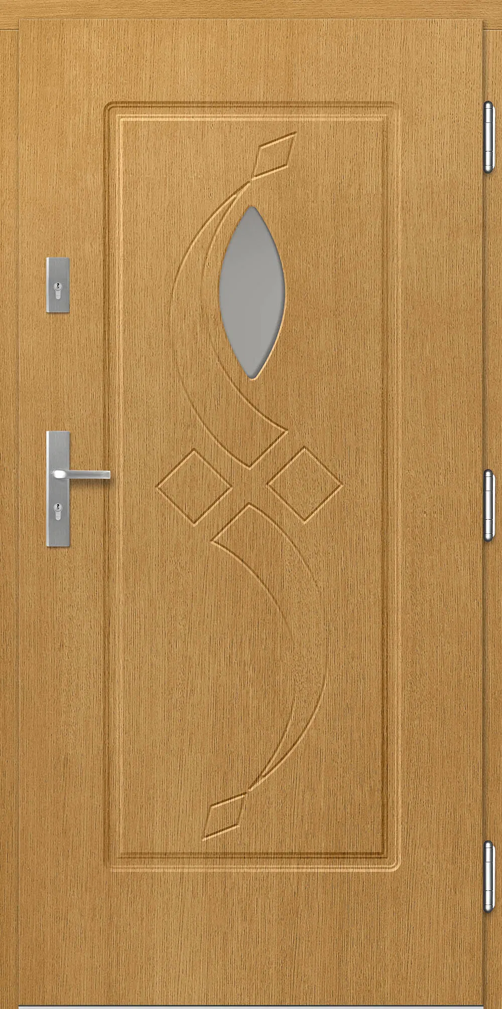 Kivitelezés: Tömítés a szárnyban és a tokban, betörésgátló csap a zsanér oldalán, a szárny külső burkolata vízálló rétegelt lemezből készült, a szárny belső szerkezete poliuretán habbal töltött méhrács.