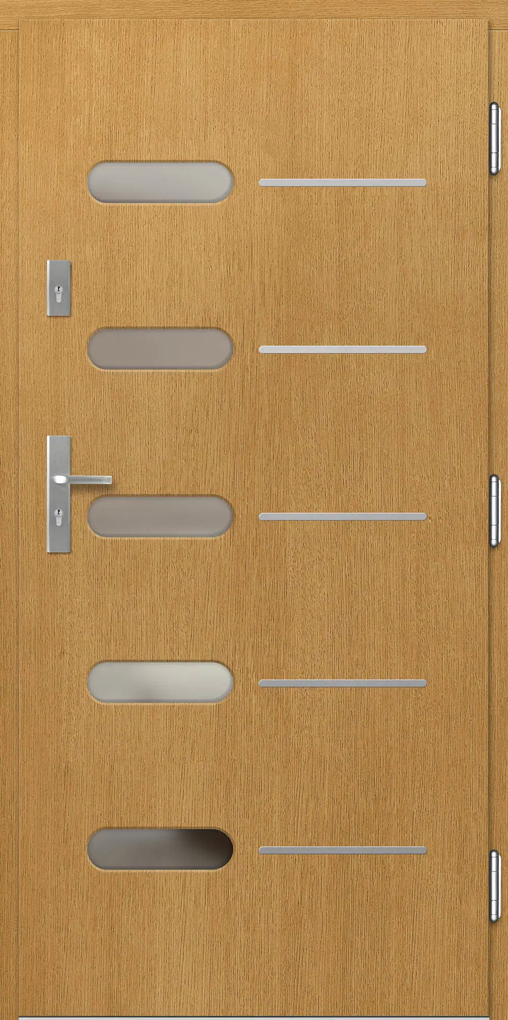 Leírás: A nemes szálcsiszolt alumínium a természetes fával együtt kiváló dizájnt képez. Az Inox betét ezenkívül védi az ajtó felületét a külső károsodásoktól.