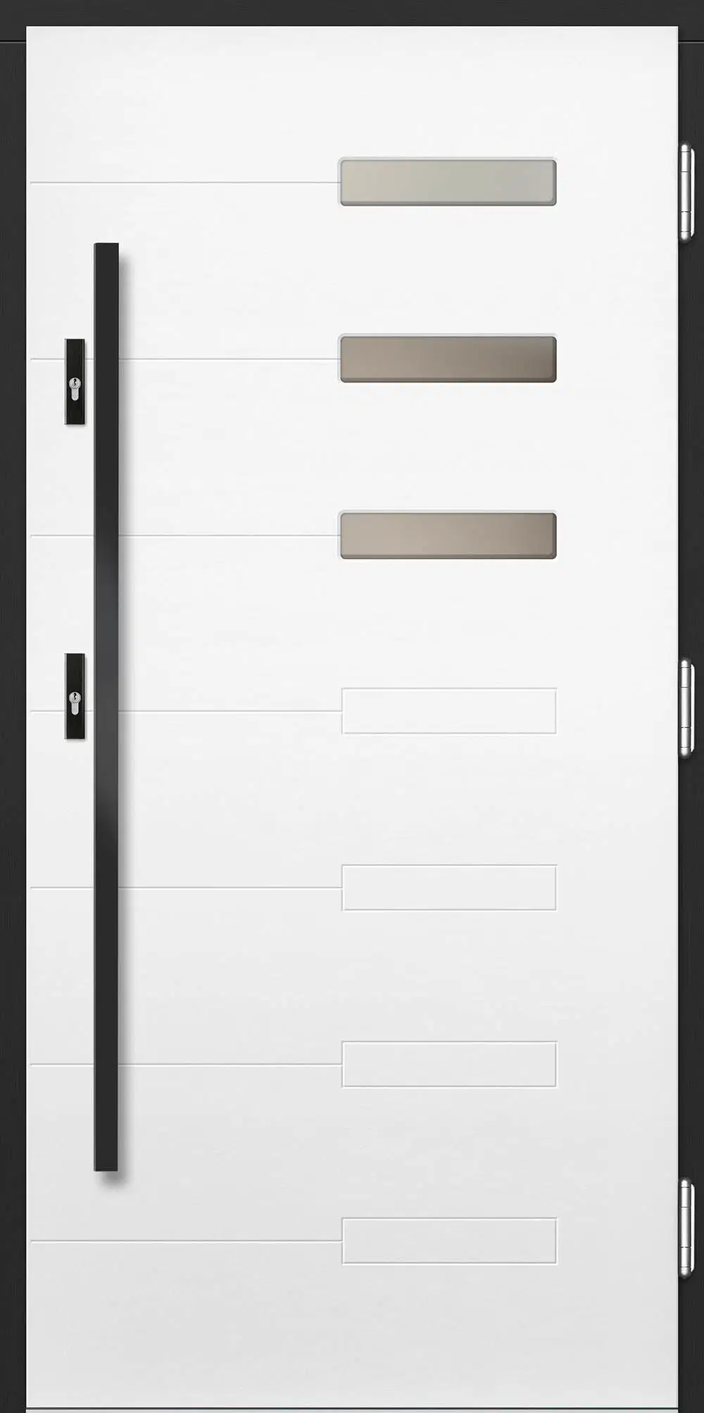 Leírás: Ezt a termékcsaládot modern mart formák és üvegezés jellemzi. A modellek geometriai ábrákon alapuló következetes mintázattal vannak ellátva.